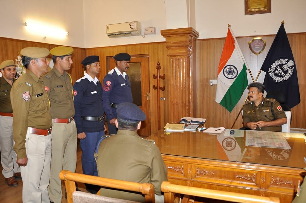 ट्रैफिक पुलिस के हैड कांस्टेबल जीत सिंह, कांस्टेबल धर्मेंद्र तथा पुलिस लाइन के कांस्टेबल विकास कुमार व मूलचंद आनन्द श्रीवास्तव के हाथों सम्मानित हो खुश नजर आये।