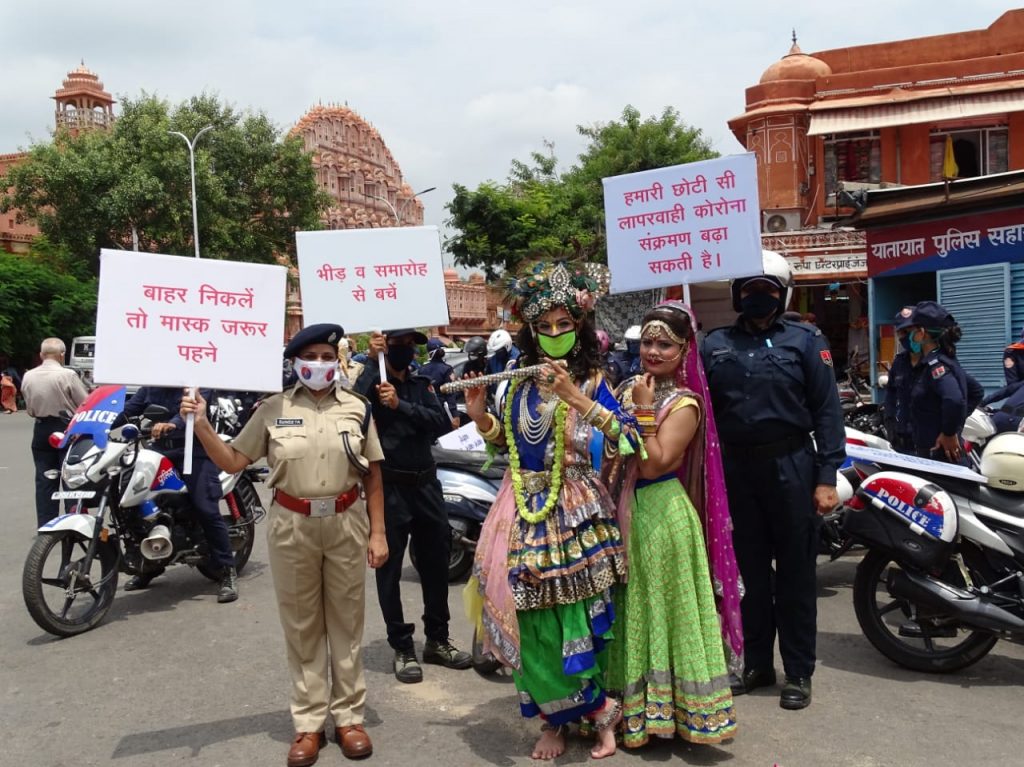 जयपुर 12अगस्त 2020।(निक विशेष) कोरोना से बचाव के लिए चलाये जा रहे जागरूकता अभियान के तहत निर्भया स्क्वॉड टीम ने बड़ी चौपड़,छोटी चौपड़ एवं अल्बर्ट हाल पर जन्माष्टमी के पर्व पर राधा कृष्ण की झाँकी निकालकर जागरूकता का संदेश दिया।