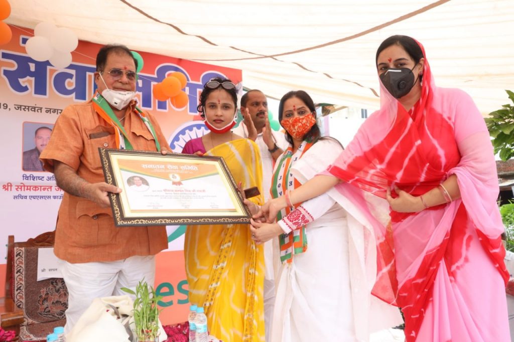 वहीं कामिनी माथुर,नेहा गर्ग व पंतजलि योग पीठ की महिला वाहिनी ने आगुन्तुकों का तिलक अक्षत, अंग वस्त्र देकर स्वागत किया ! डेढ़ घंटे का कार्यक्रम देश भक्ति व नागरिकों के नैतिक बोध से ओत-प्रोत रहा ! समिति की महिला निदेशक पुष्पा राठौर,डॉ मंजुला भाटी व कामिनी माथुर ने मुख्य व विशिष्ट अथितियो को स्मृति चिन्ह व शाल ओढ़ा कर स्वागत किया वही समिति अध्यक्ष गणेश सिंह, निदेशक वीरेंद्र सिंह, हेमेंद्र सिंह, हिम्मत सिंह, जीतेन्द्र कुमावत, हरिओम भारद्वाज, राम नारायण जांगिड़, अनिल जैन,तरुण शर्मा, दीपक कुमावत आदि ने माल्यार्पण से मुख्य व विशिष्ट अतिथियों का स्वागत किया ! कार्यक्रम की कड़ी मे “प्रयास एक कोशिश” एन जी ओ की और से सनातन सेवा समिति के कोरोना योद्धाओ को स्मृति चिन्ह, महिला पंतजलि योग पीठ की और से प्रशिक्षित शिक्षक शिक्षिकाओं का सम्मान प्रशस्ति देकर किया गया, फुलेरा से पधारे गौ सेवक अमर चंद जी व झोटवाड़ा से राहुल व विनय जी को भी सम्मानित किया गया ! कार्यक्रम के अंत मे सनातन सेवा समिति के सचिव राम कुमावत ने सभी अतिथियो, आगंतुकों व नागरिकों को धन्यवाद दिया !