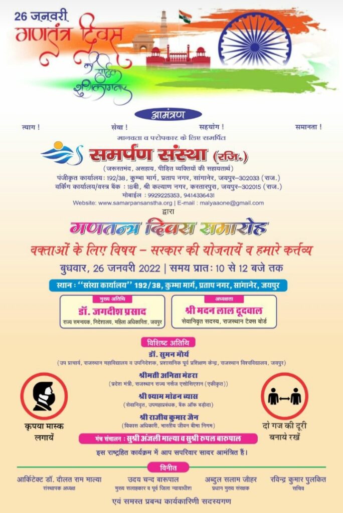 समर्पण संस्था द्वारा 73 वें गणतन्त्र दिवस पर ध्वजारोहण व ‘‘ सरकार की योजनाएँ व हमारे कर्तव्य “ विषयक विचार गोष्ठी 26 जनवरी को ,,,