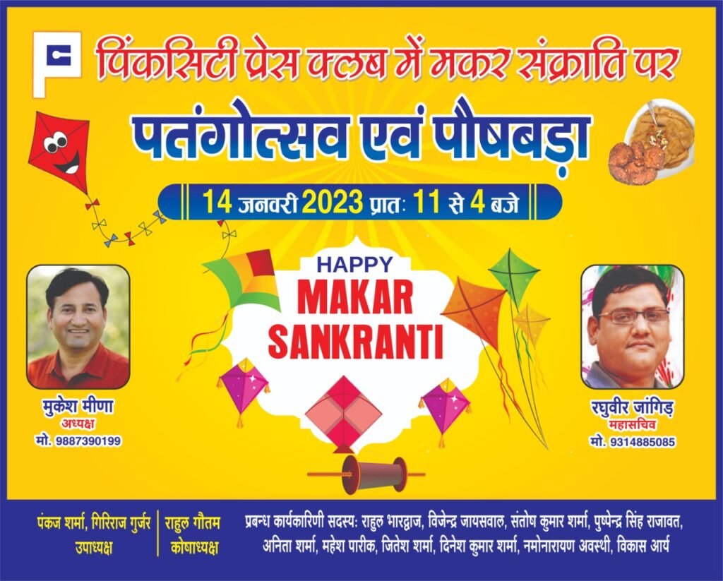 जयपुर 13 जनवरी 2023।(निक विशेष) परम्परा को कायम रखते हुए पिंक सिटी प्रेस क्लब की ओर से मकर संक्रांति 14 जनवरी 2023 शनिवार को ‘पतंगोत्सव’ और पौषबडे का आयोजन होगा।
