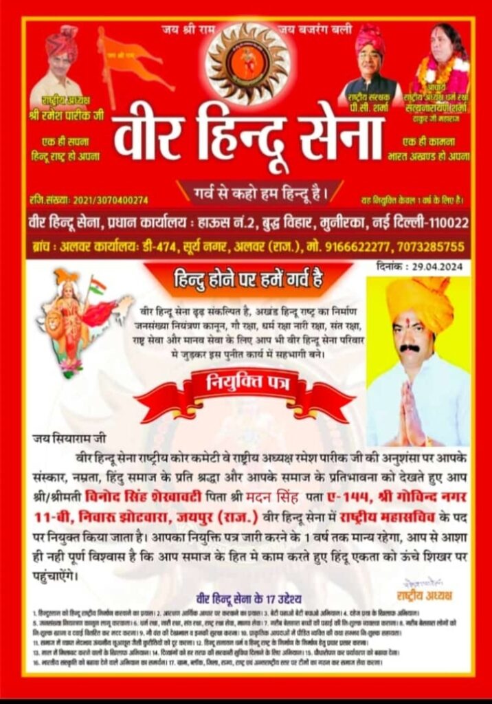 जयपुर 30 अप्रैल 2024।(निक सामाजिक) वीर हिंदू सेना ने 29 अप्रैल सोमवार को राष्ट्रीय अध्यक्ष रमेश पारीक ने संगठन की कार्यकारिणी का विस्तार करते हुए विनोद सिंह शेखावटी को राष्ट्रीय महासचिव की नियुक्ति प्रदान की।